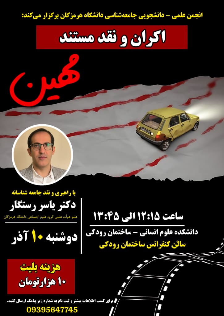 انجمن علمی جامعه‌شناسی دانشگاه هرمزگان اکران و نقد تخصصی مستند «مهین» را با حضور دکتر یاسر رستگار در روز دوشنبه ۱۰ آذر در سالن کنفرانس دانشکده رودکی برگزار می‌کند. دانشجویان علاقه‌مند می‌توانند با پرداخت ۱۰ هزار تومان و از طریق لینک ثبت‌نام، در این برنامه علمی ـ تحلیلی شرکت کنند.