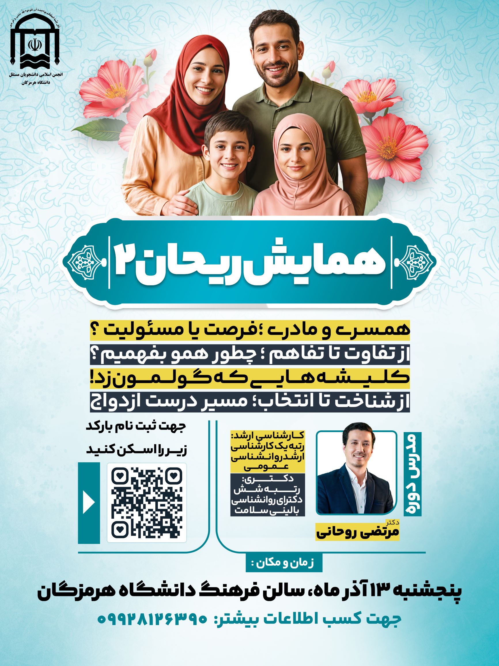 دومین دوره همایش ریحان با محوریت «زنان و خانواده» روز پنج‌شنبه ۱۳ آذرماه با حضور دکتر مرتضی روحانی در تالار فرهنگ برگزار می‌شود؛ رویدادی متفاوت که با هدف ایجاد فضای گفت‌وگوی سالم، صمیمی و بدون قضاوت برای دانشجویان و دانشگاهیان طراحی شده است. این همایش تلاش دارد با نگاهی نو، از هویت فردی تا مسیر انتخاب همسر، دغدغه‌های واقعی نسل امروز را با زبان ساده، علمی و کاربردی بررسی کند.